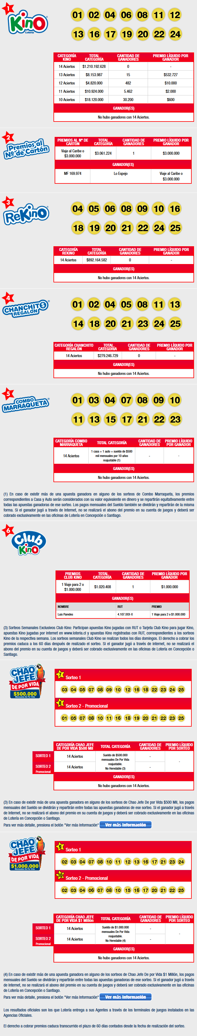 Kino 2033 – Resultados Kino Loteria Chile – Domingo 07 de Enero del 2018