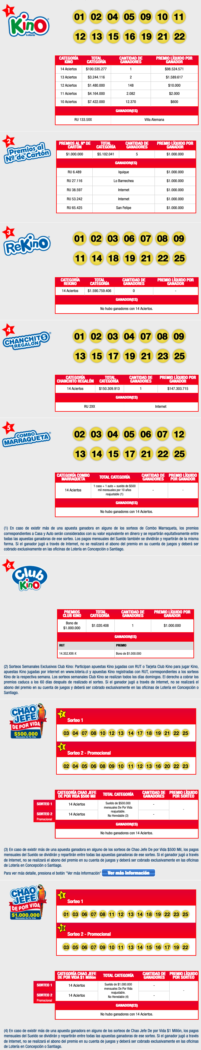 A continuación te traemos los Resultados del Kino del Domingo 07 de Junio del 2020, que corresponden al Sorteo 2298. Puedes ver los Resultados del Kino, Premios al Número de Cartón, Rekino, Chanchito Regalón, Combo Marraqueta, Club Kino y sorteos Chao Jefe. Esperamos tengas mucha suerte.