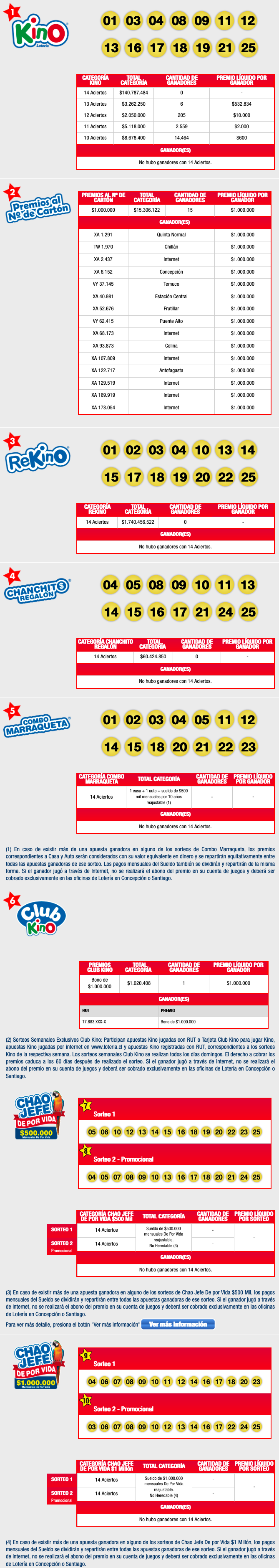 Buenas noches y bienvenidos a nuestro sitio web de Resultados Kino Chile. Les agradecemos su visita y en esta ocasión les traemos los Resultados Kino Sorteo 2304 correspondientes al día Domingo 21 de Junio del 2020. En la siguiente imagen podrán revisar los resultados completos del juego de Loteria Chile, y sus respectivos ganadores.