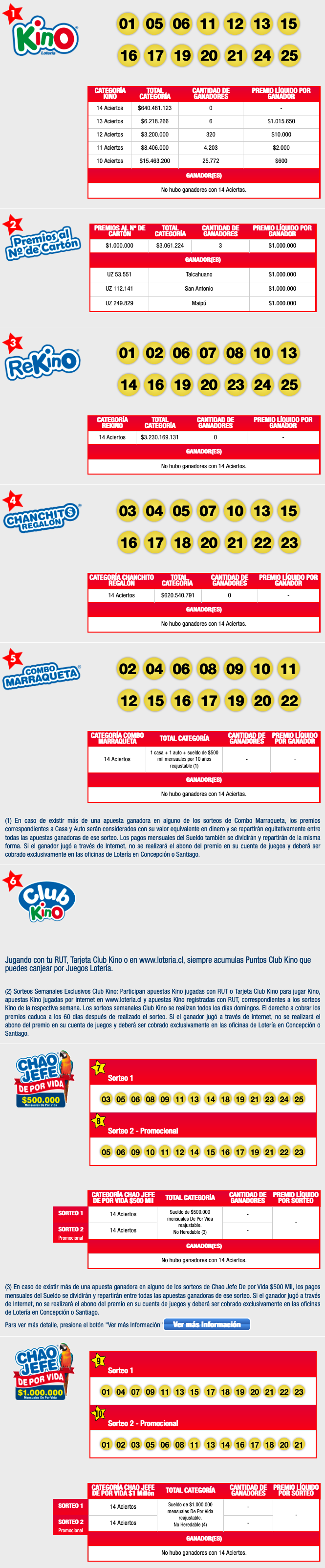 Buenas noches y bienvenidos a nuestro sitio web de Resultados Kino Chile. Les agradecemos su visita y en esta ocasión les traemos los Resultados Kino Sorteo 2353 correspondientes al día Miércoles 14 de Octubre del 2020. En la siguiente imagen podrán revisar los resultados completos del juego de Loteria Chile, y sus respectivos ganadores.
