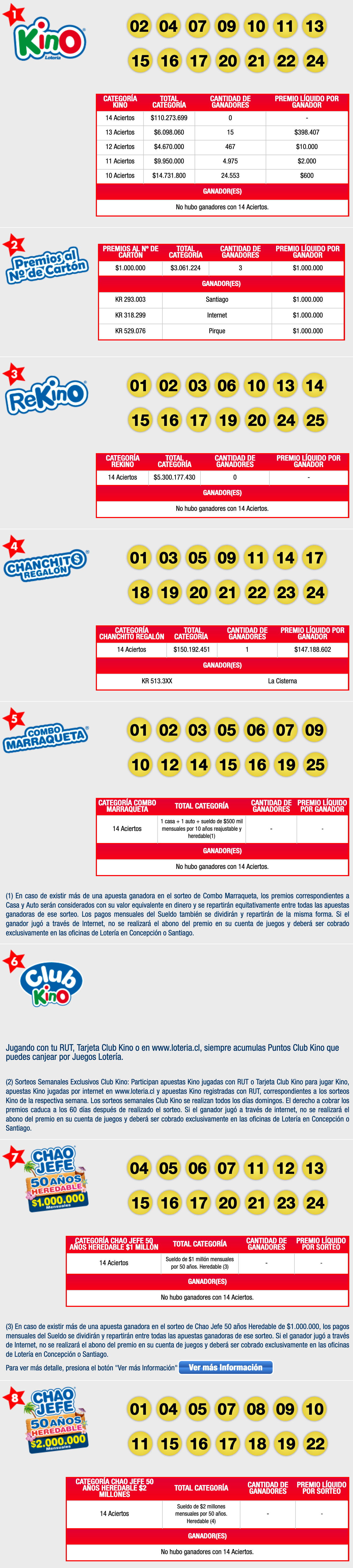 A continuación te traemos los Resultados del Kino del Miércoles 20 de Enero del 2021, que corresponden al Sorteo 2395. Puedes ver los Resultados del Kino, Premios al Número de Cartón, Rekino, Chanchito Regalón, Combo Marraqueta, Club Kino y sorteos Chao Jefe. Esperamos tengas mucha suerte.