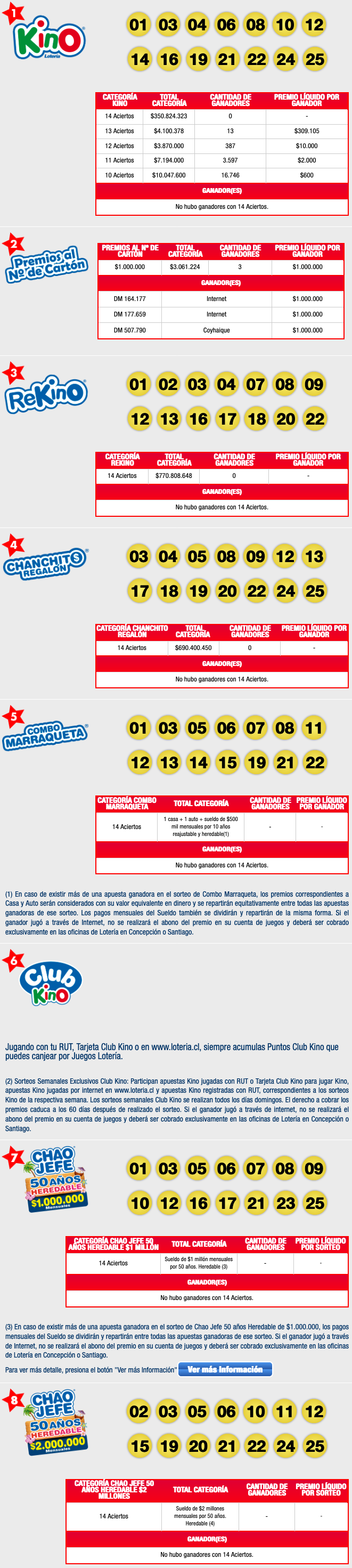 A continuación te traemos los Resultados del Kino del Miércoles 05 de Mayo del 2021, que corresponden al Sorteo 2440. Puedes ver los Resultados del Kino, Premios al Número de Cartón, Rekino, Chanchito Regalón, Combo Marraqueta, Club Kino y sorteos Chao Jefe. Esperamos tengas mucha suerte.