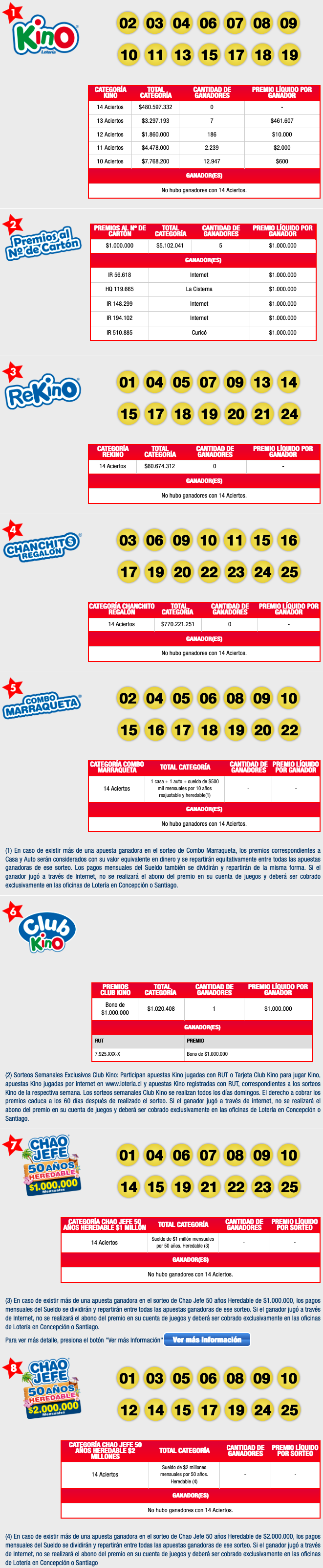 Les deseamos mucha suerte y que nos sigan visitando sorteo a sorteo para conocer los números ganadores del gran juego Kino de Loteria.