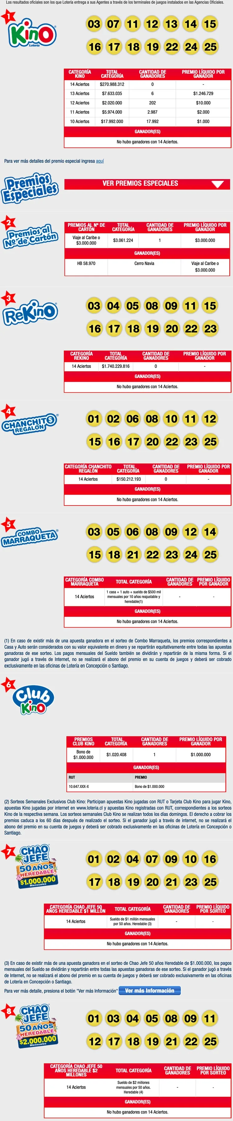 En la siguiente imagen podrá revisar los resultados completos del juego de Loteria Chile, y sus respectivos ganadores.