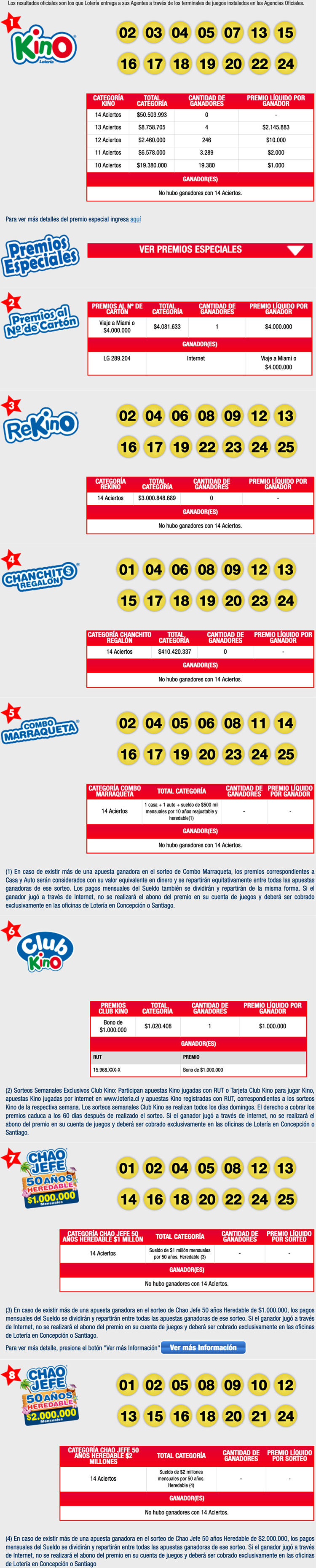 En la siguiente imagen podrá revisar los resultados completos del juego de Loteria Chile, y sus respectivos ganadores.
