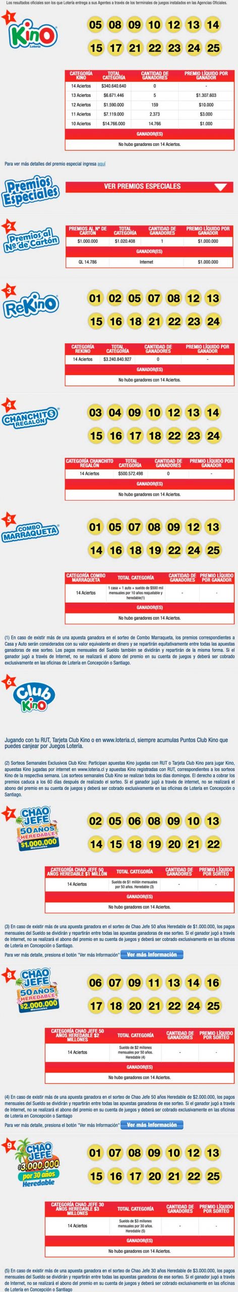 En la siguiente imagen podrá revisar los resultados completos del juego de Loteria Chile, y sus respectivos ganadores.