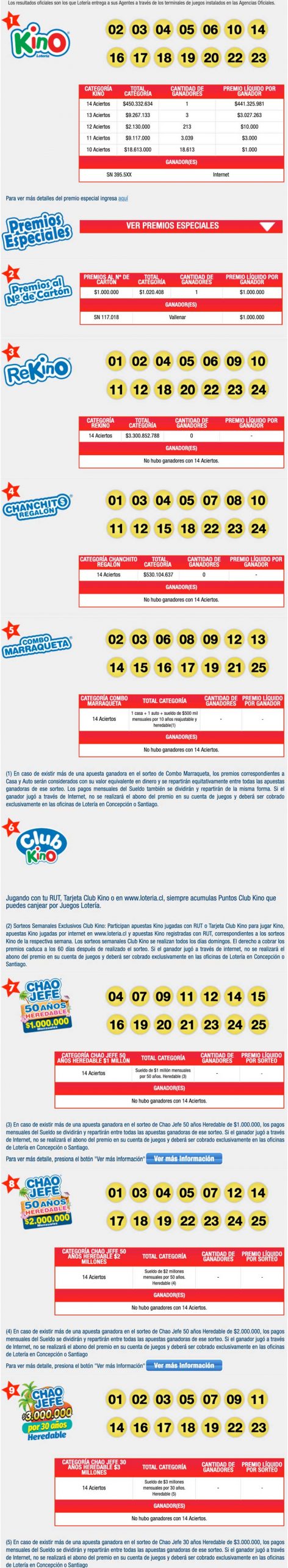 En la siguiente imagen podrá revisar los resultados completos del juego de Loteria Chile, y sus respectivos ganadores.