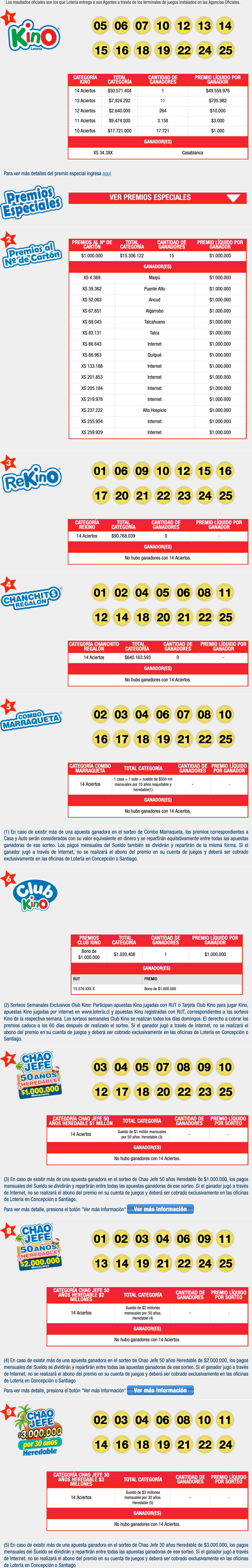 En la siguiente imagen podrá revisar los resultados completos del juego de Loteria Chile, y sus respectivos ganadores.