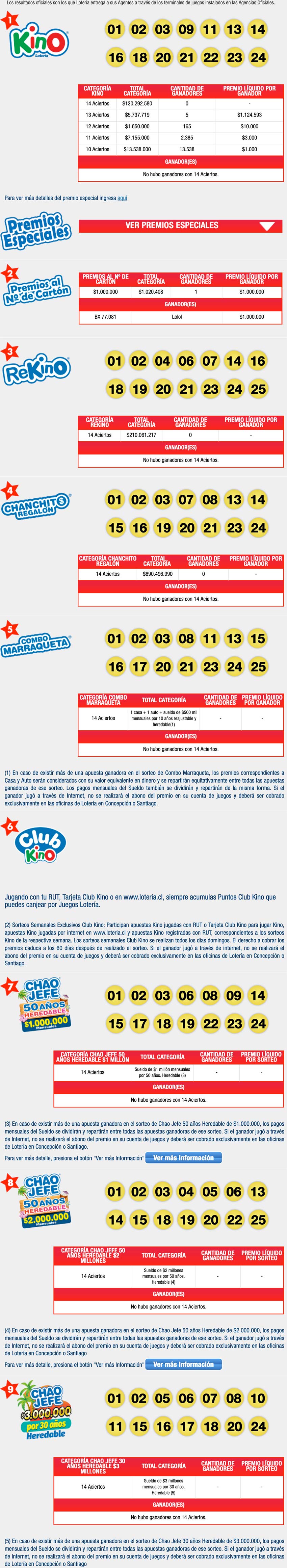 En la siguiente imagen podrá revisar los resultados completos del juego de Loteria Chile, y sus respectivos ganadores.
