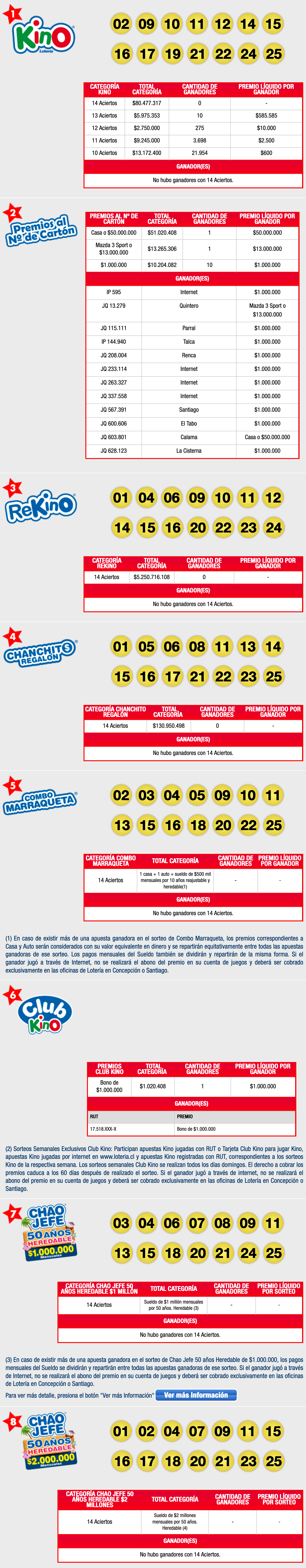 A continuación te traemos los Resultados del Kino del Domingo 17 de Enero del 2021, que corresponden al Sorteo 2394. Puedes ver los Resultados del Kino, Premios al Número de Cartón, Rekino, Chanchito Regalón, Combo Marraqueta, Club Kino y sorteos Chao Jefe. Esperamos tengas mucha suerte.